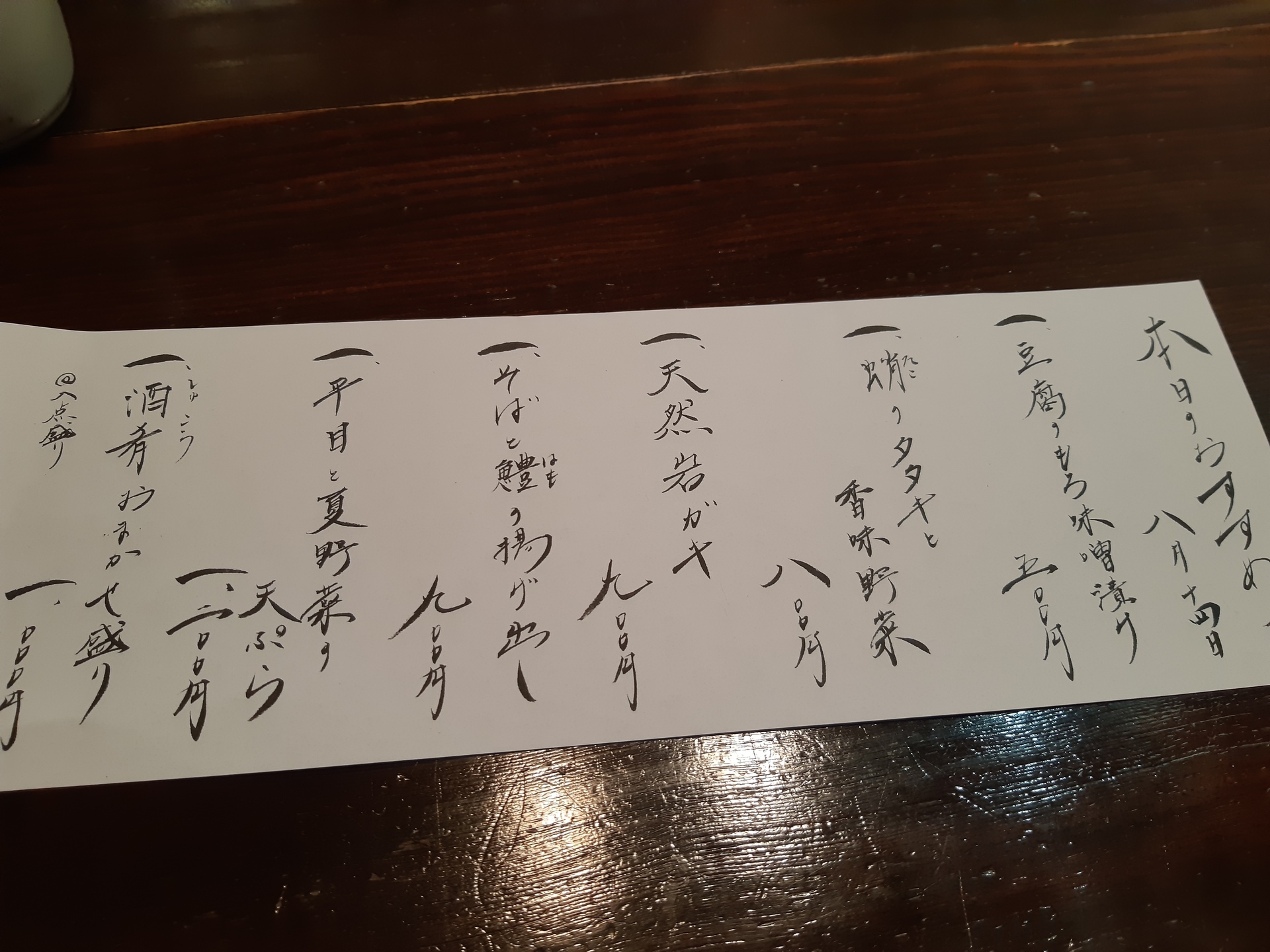 陽の高い夕方から旬の肴でうまい酒が飲める事に感謝しつつ、本日のおすすめが書かれたお品書きに目を通します。夏らしい涼しげな料理がずらりと書かれており、どれを頼んだらよいのか迷ってしまいます。そんな時には、後で後悔しないために、気になったものを一通り注文するようにしています(笑)