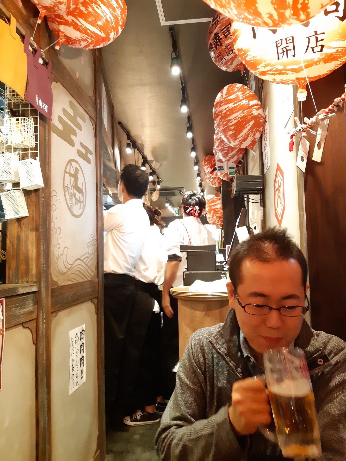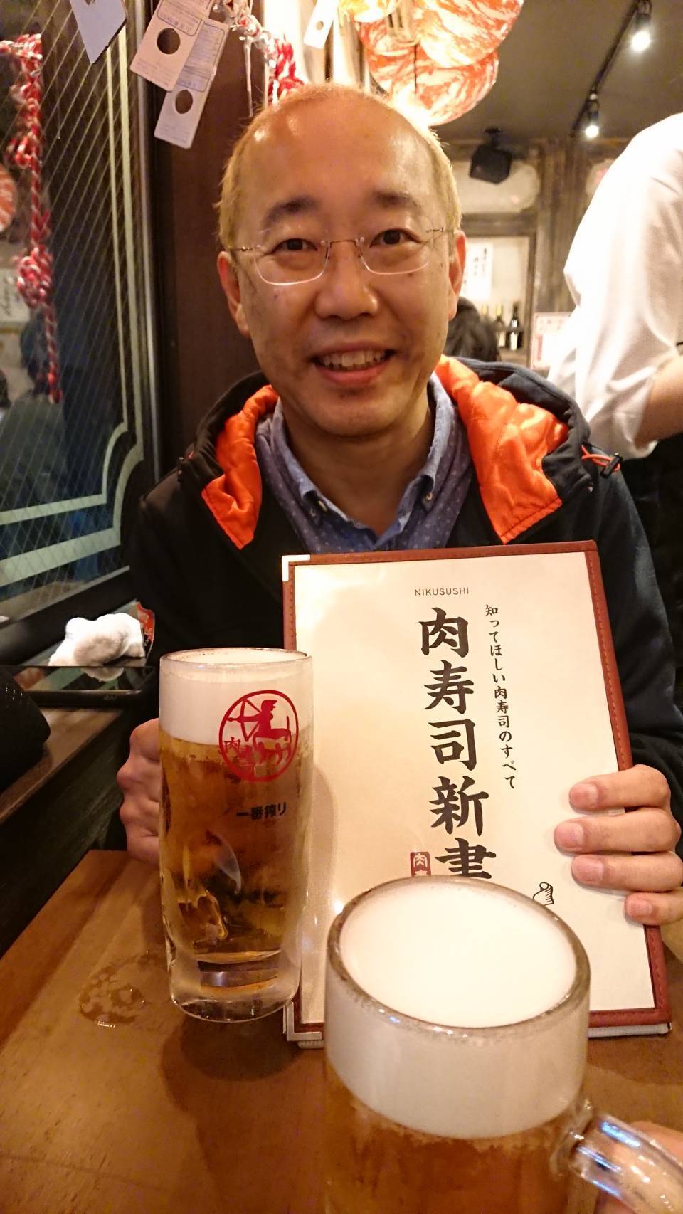 席に着くと、開店サービスの肉寿司『赤身一貫』とおみくじ付きのお箸が運ばれてきました。このおみくじ付きお箸は、その運勢で色々なサービスが受けられるそうです。早速、、生ビールを飲みながら初肉寿司のメニューに目を通しました。
