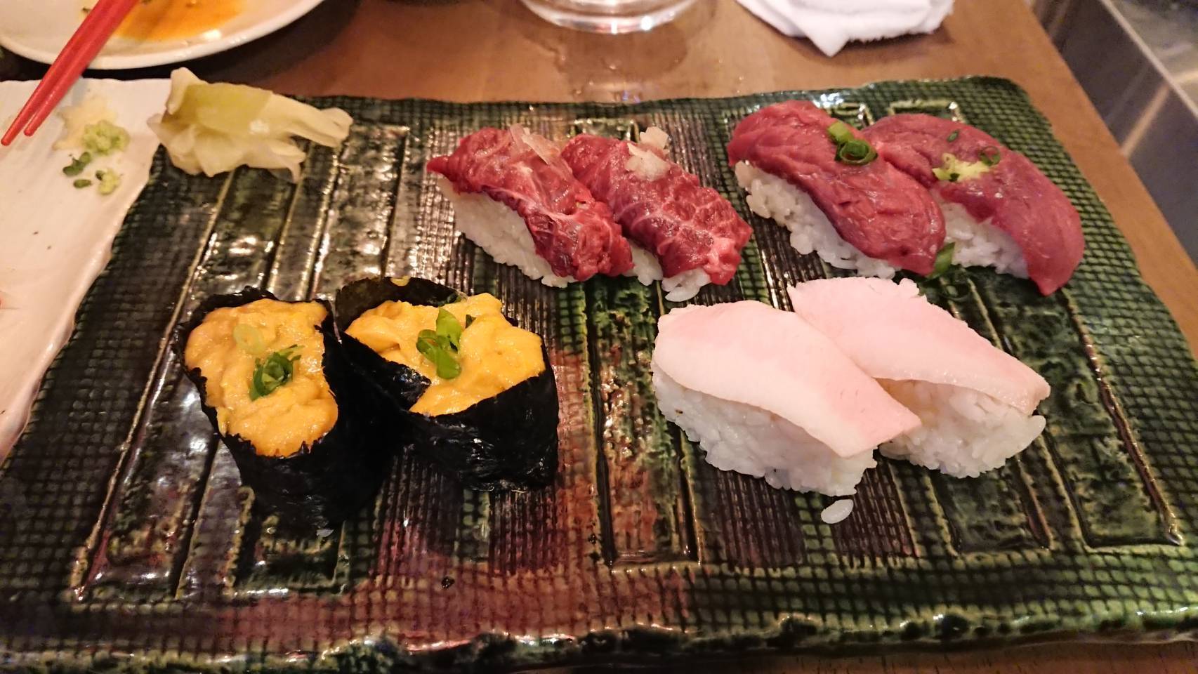 メインの『肉寿司』以外にも、肉の刺身や肉を使った一品料理が豊富で、その中から『桜肉の刺身』と『ユッケ』、『五種肉の盛り合わせ』を選びました。もちろん、肉寿司盛り合せも忘れていません!生のお肉は苦手・・、という方も多いと思いますが、サッパリとした口当たりで食べやすかったです。