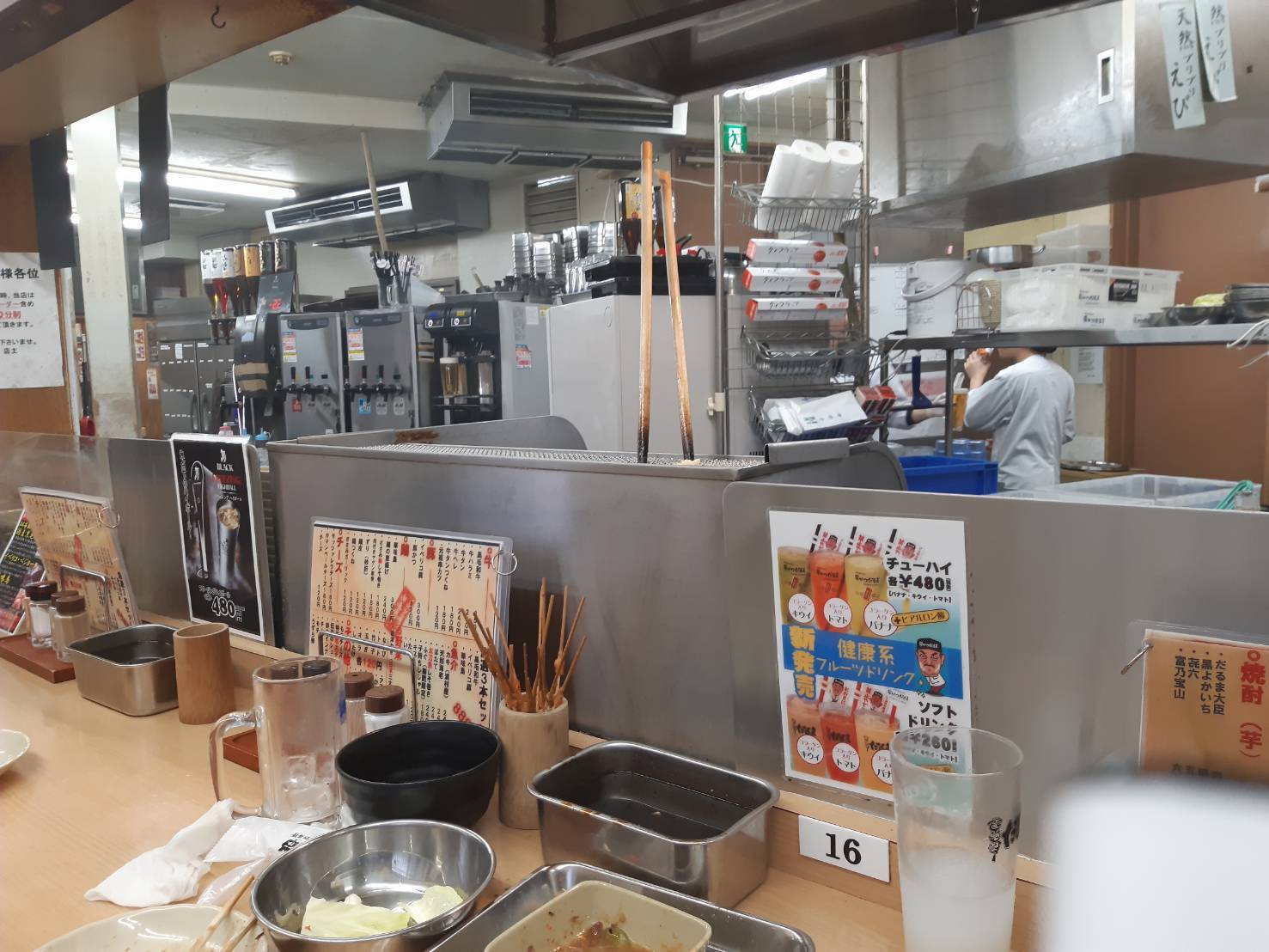 店の前にはすでに長蛇の行列ができていましたが、意外と早くカウンターの席に座ることができました。串かつ初体験なので、お店一押しの通天閣セット(串カツ15本、どて焼き)に、定番の紅ショウガ串、生ビール、レモン酎ハイを注文しました。