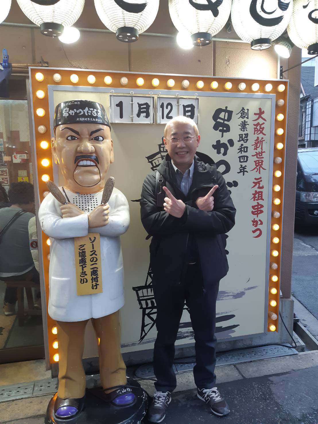 まずは、インスタ映えする大きなふぐの提灯をバックに記念写真を撮ってから、いざ、通天閣へ。40分ほどかけて念願のビリケンさんにご挨拶を済ませた後は、通天閣の足元に店を構える、昭和4年創業の『串かつだるま』さんへ伺いました。