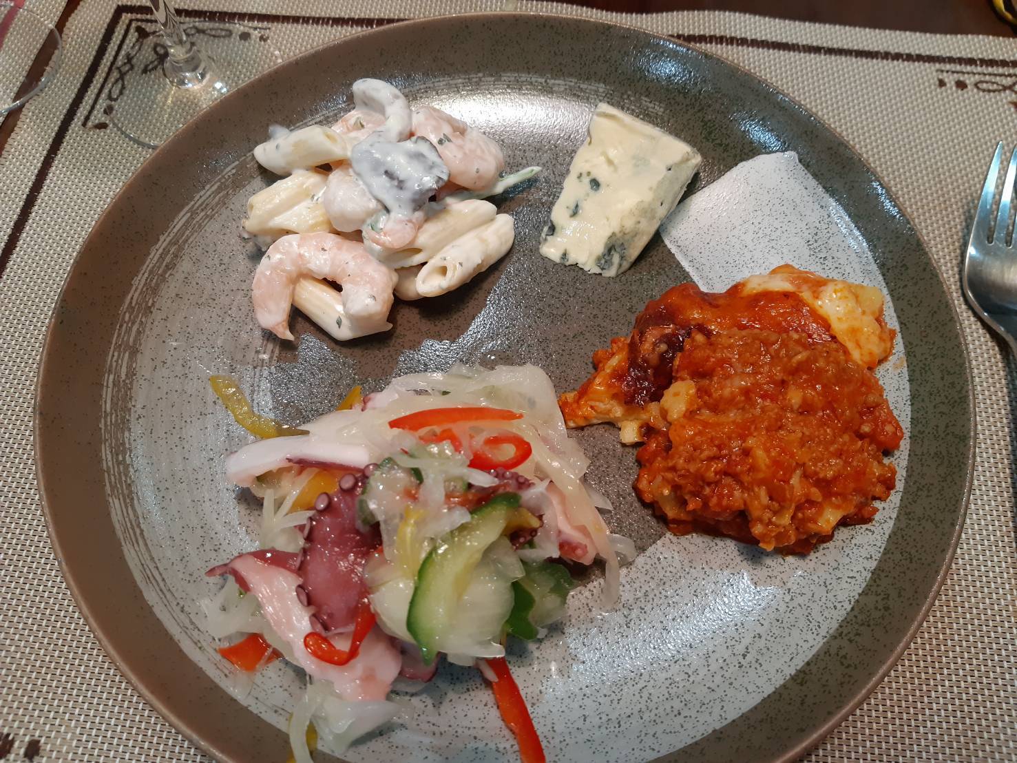 皿の中には『タコのマリネ』、『ペンネとブロッコリーのゴルゴンゾーラソース』、『ラザニア』、『ブルーチーズ』を盛り付け、他にも、『チキンステーキのバジルソース』を用意しました。