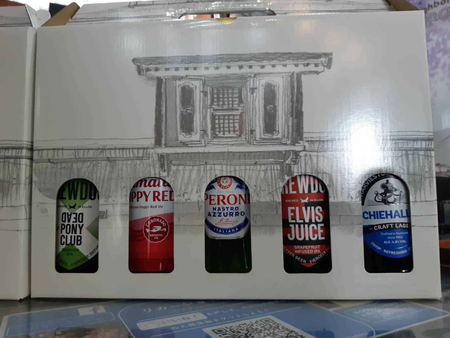 昨年より取り扱いを始めたクラフトビールですが、種類が多くなるにつれ、ご贈答品としてお買い求める方が多くなってきています。そこで、瓶と缶の両方を詰めることができる、こんなギフトボックスをご用意してみました。瓶と缶が5本入る仕様となっていて、持ち手もついているので、このまま差し上げることができます。これならば、ちょっとした手土産としてクラフトビールを差し上げる時に便利です。
