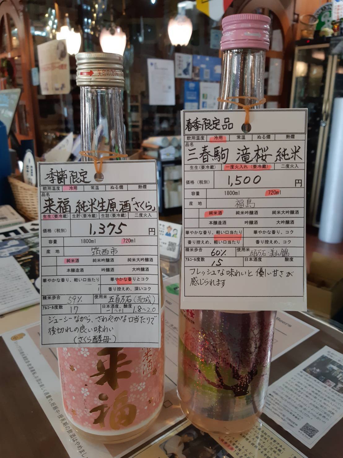 今日は、来福酒造さんの桜の花酵母お酒と、佐藤酒造さんの滝桜をイメージしたお酒をご紹介させていただきました。是非、この機会にお楽しみください。