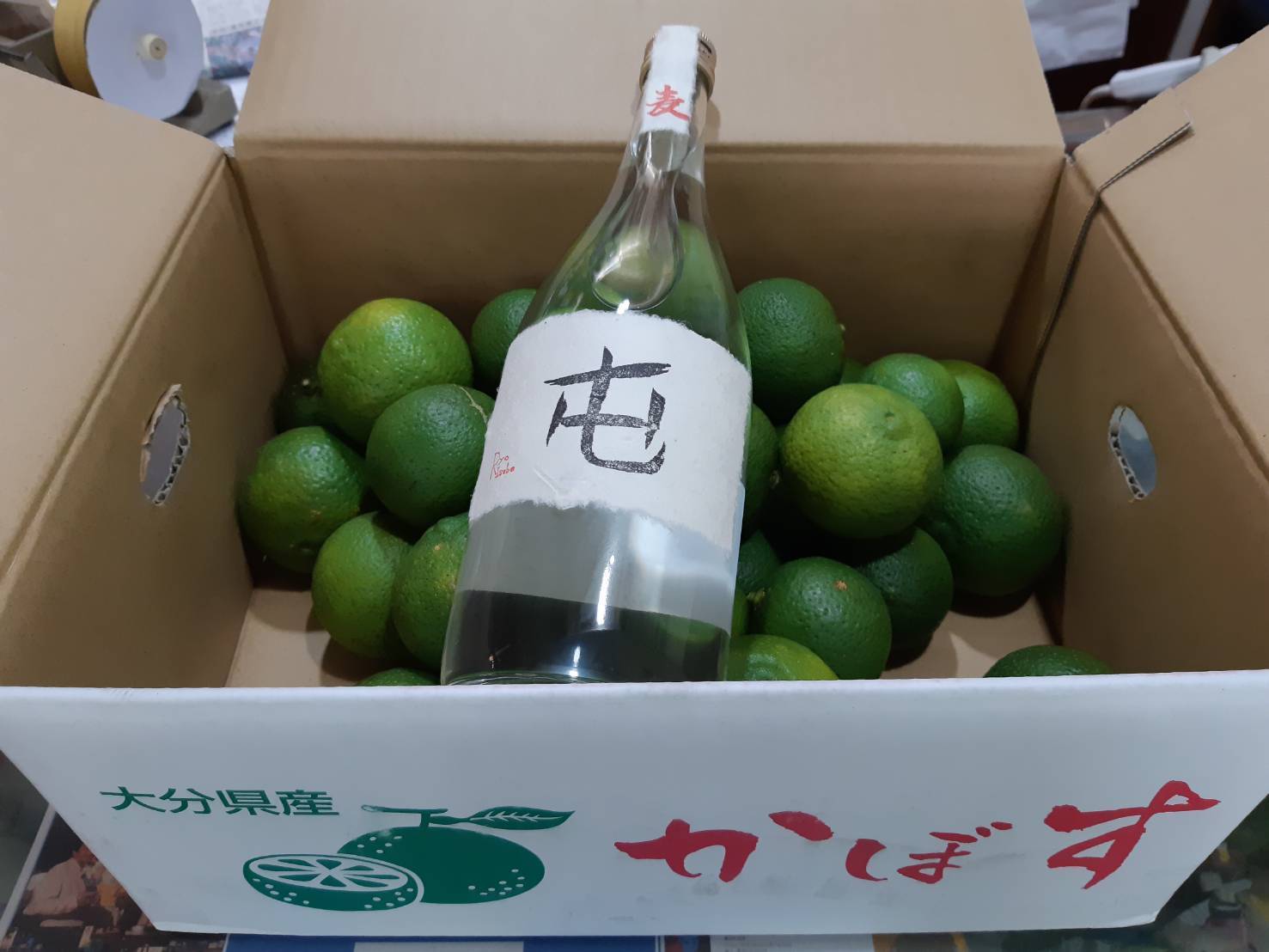 今年も箱一杯に詰まったカボスが大分県の蔵元様から届きました!贈り主は、当店でも大人気の麦焼酎『屯(たむろ)』を造っている蔵元『ぶんご銘醸』様で、毎年この季節になると段ボール箱一杯に送ってくれるので、とても楽しみにしています!カボスと言えば、サンマやマツタケなどに使うのが一般的ですが、地元では、刺身や焼き肉、焼き魚など、何にでも使うそうです。
