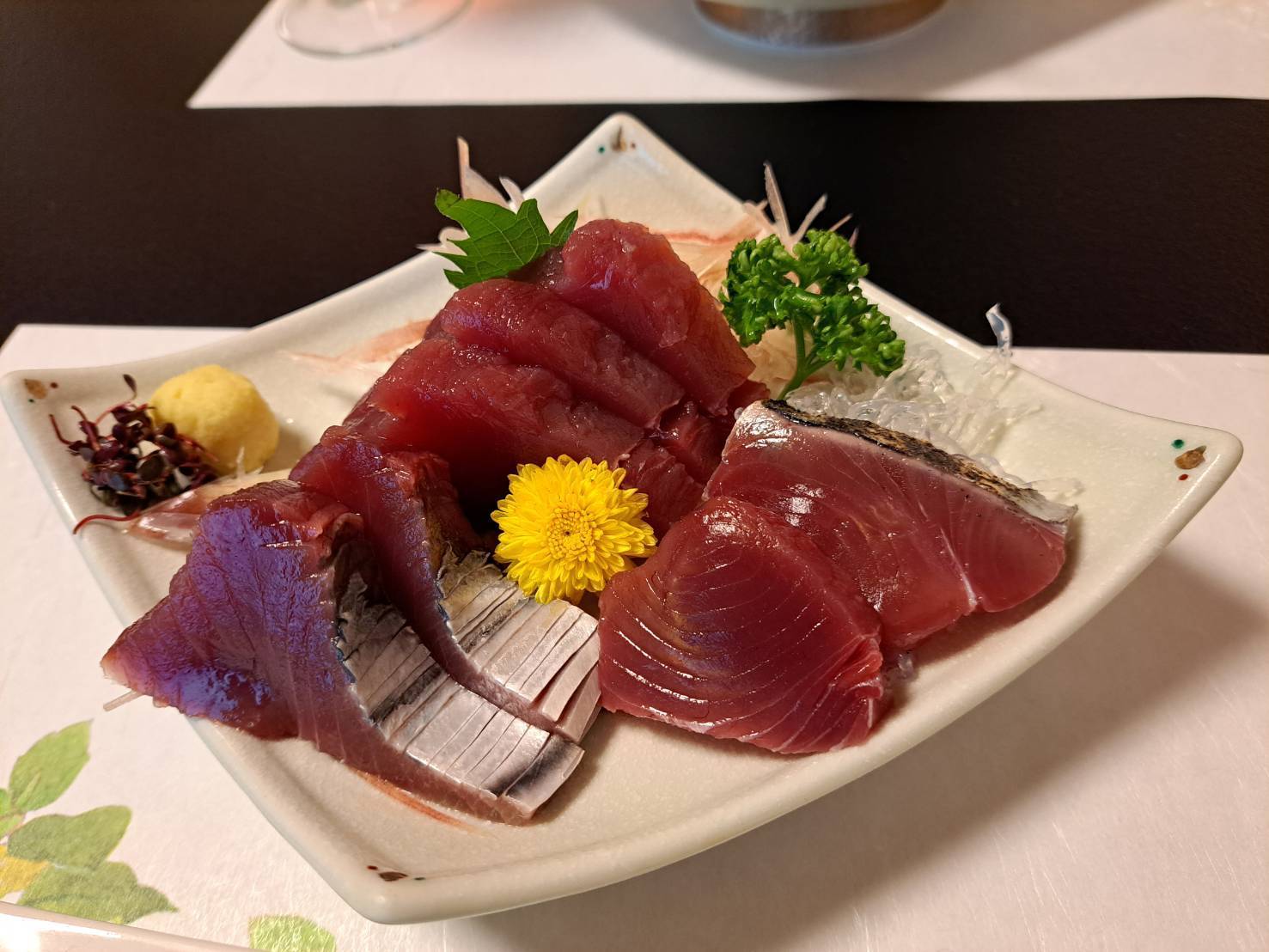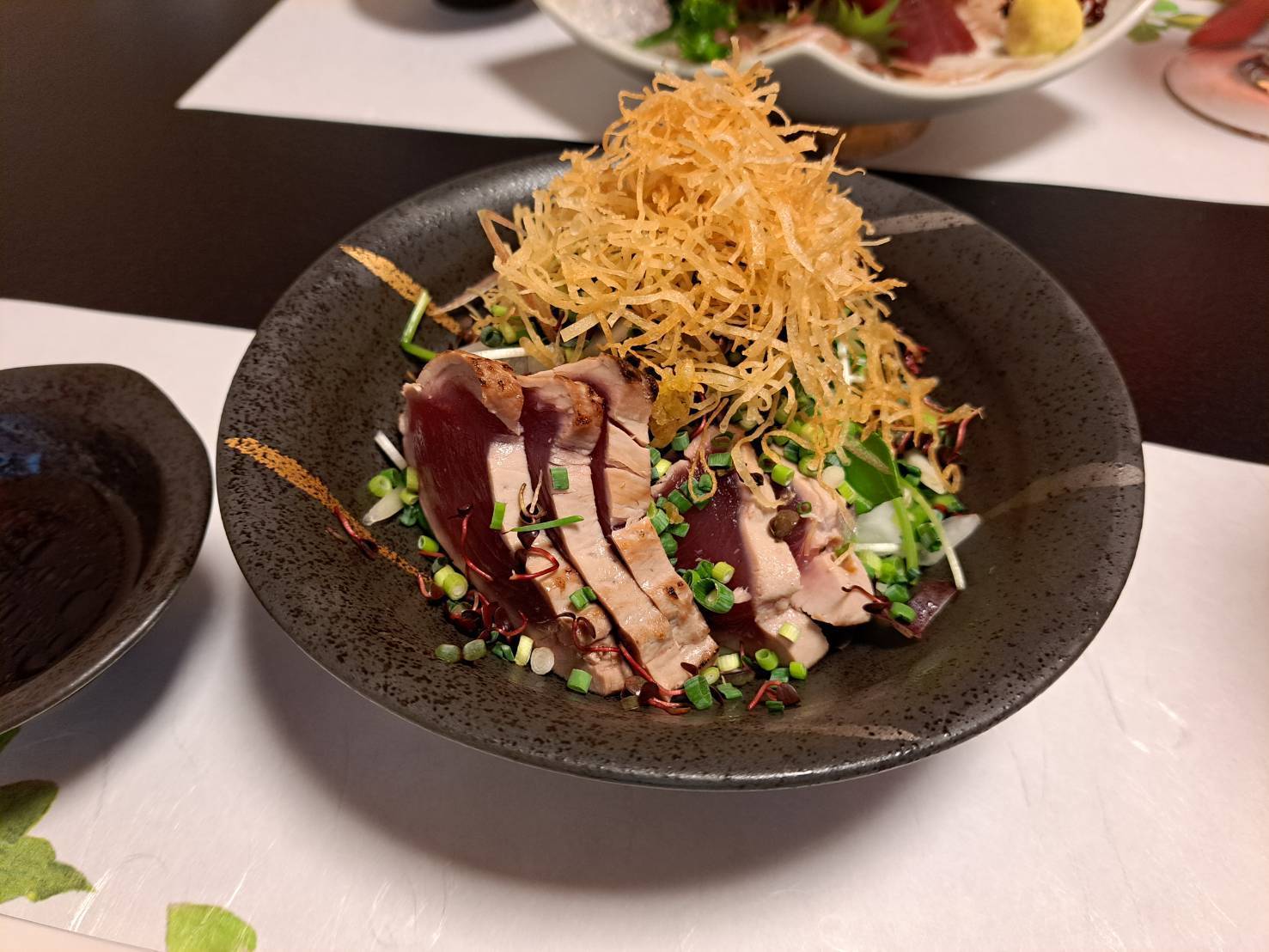 お料理はおまかせコースをお願いしました。まずは前菜に合わせて、国産スパークリングロゼで乾杯。続いて登場してきたのは、脂ののったカツオのお刺身盛り合わせです。これが一人前?と驚いてしまうほどのボリュームで、旨味が詰まった肉厚の切り身は、カツオ好きにはたまりません。付け合せのミョウガの千切りも素晴らしいアクセントになっています。また、生魚が苦手なみどりさんには、カツオのたたきサラダ仕立てが用意される心配りが嬉しいですね。
