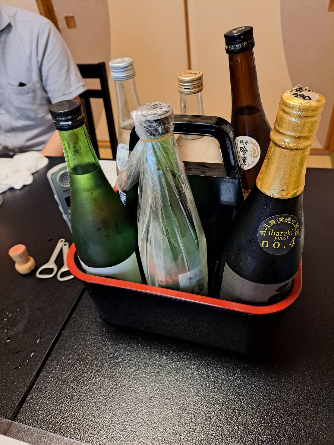 そして、いよいよ日本酒に突入。花村さんでは、地元茨城の日本酒を中心に取り揃えており、旬の味わいが四合瓶で楽しむことが出来ます。また、その日のお勧め日本酒(四合瓶)をおかもちに入れて席まで持ってきてくれ、その中から好きな銘柄を選ぶことが出来ますので、日本酒好きには有難いサービスです。