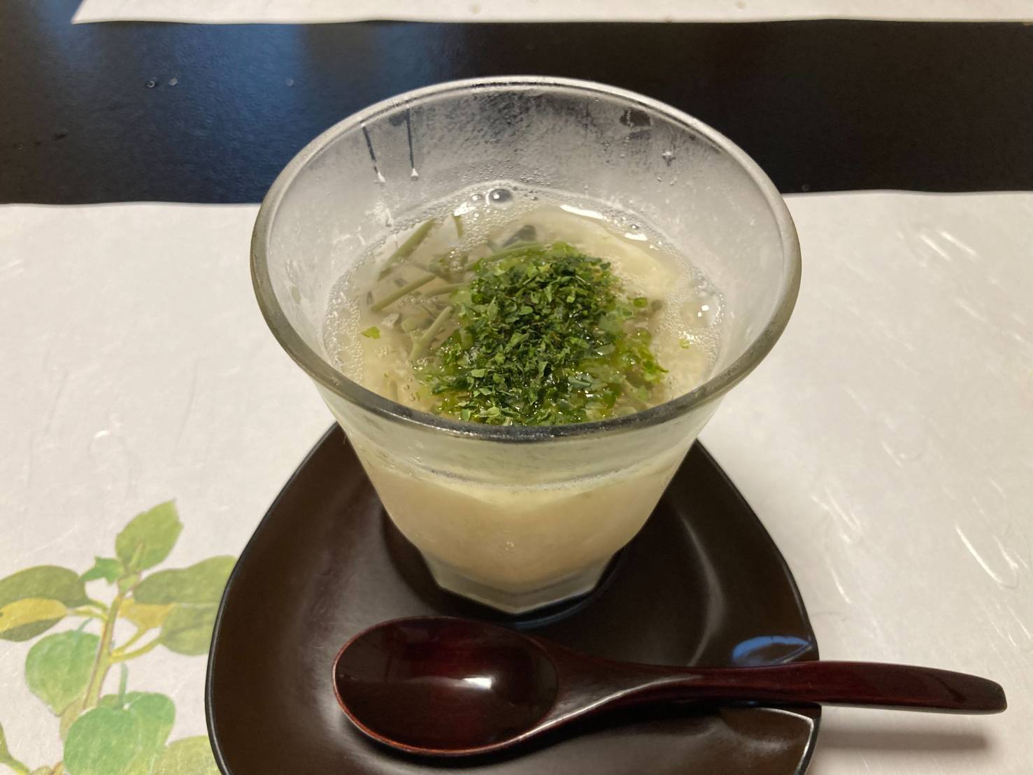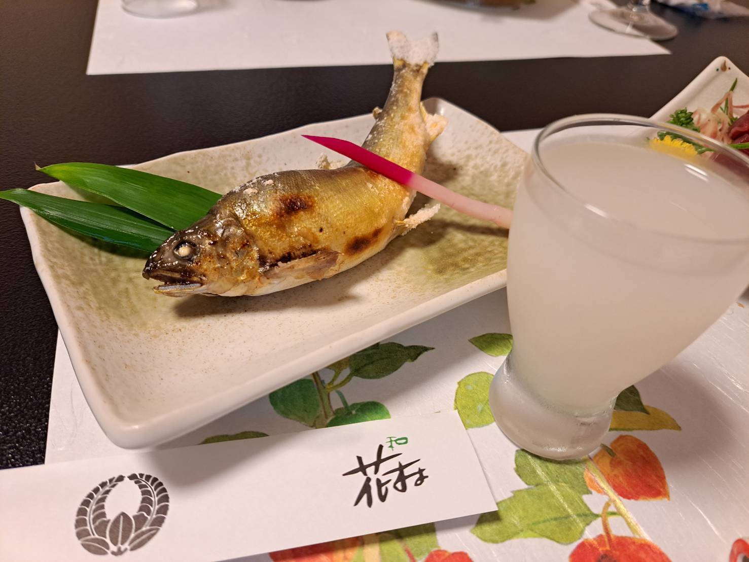 お勧めの日本酒が決まった所で、身の詰まったアユの塩焼き、角切り山芋とジュンサイの入った冷たい山芋のスープが運ばれてきました。冷製のスープは、初めて食べる味わいで、和食料理人の技が感じられる旨さです。