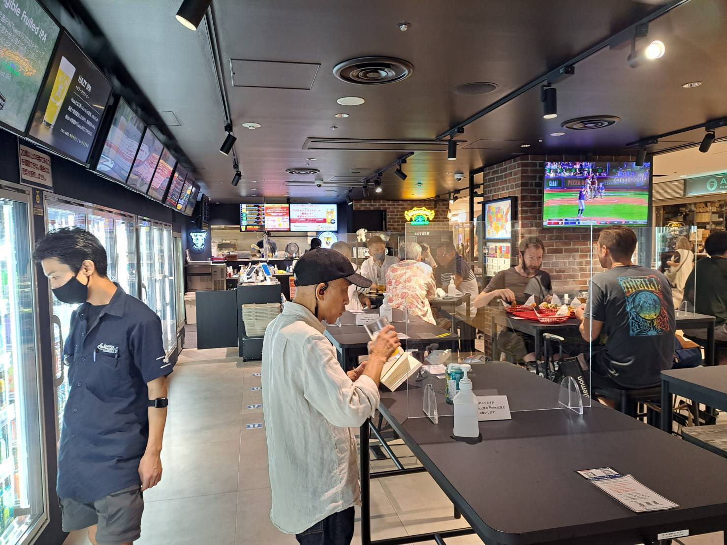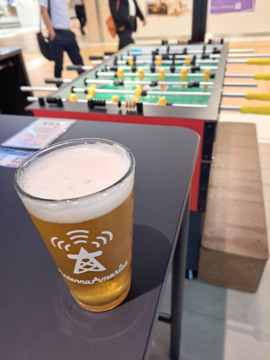 東京駅の地下街にあるオープンスペースの店舗ですが、店内に一歩足を踏み入れると、そこはまさにアメリカのビアバーです!店内には、テーブルサッカーゲームがおかれ、テレビモニターでは大リーグの映像が流れていました。この日は、日曜日の昼時にもかかわらず、ビールを楽しむ方でとても賑わっていました。