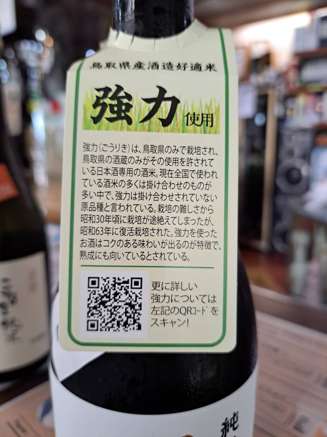 もう一つは、蔵の代表銘柄でもある『千代むすび・純米吟醸ひやおろし』で、鳥取県固有の酒米『強力(精米歩合50%)』のみで醸しています。搾った直後に加水することなく瓶詰め火入れし、マイナス5度の氷温庫にて貯蔵熟成させた特別バージョンです!強力米が持つ力強いコクと旨味が感じられる逸品です。ちなみにこの米の読み方は『きょうりょく』ではなく、『ごうりき』と読みます(笑)